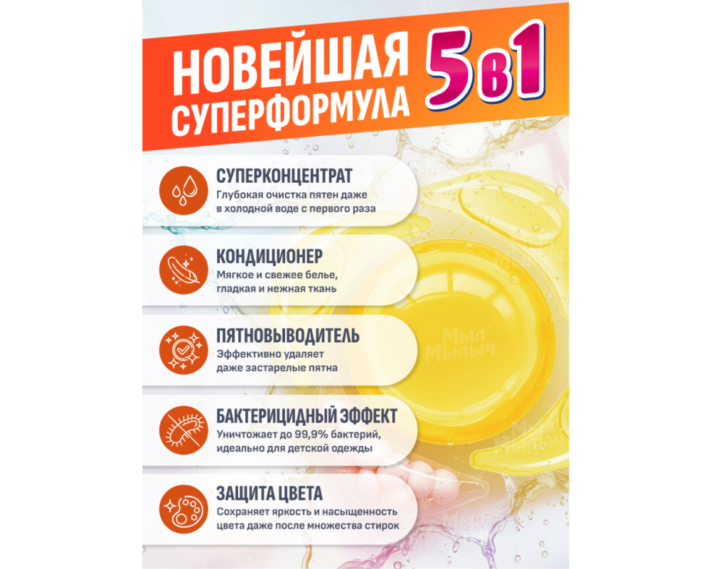 🌿 5 в 1: мощное очищение, удаление пятен, антибактериальный эффект, кондиционер и смягчение воды.
